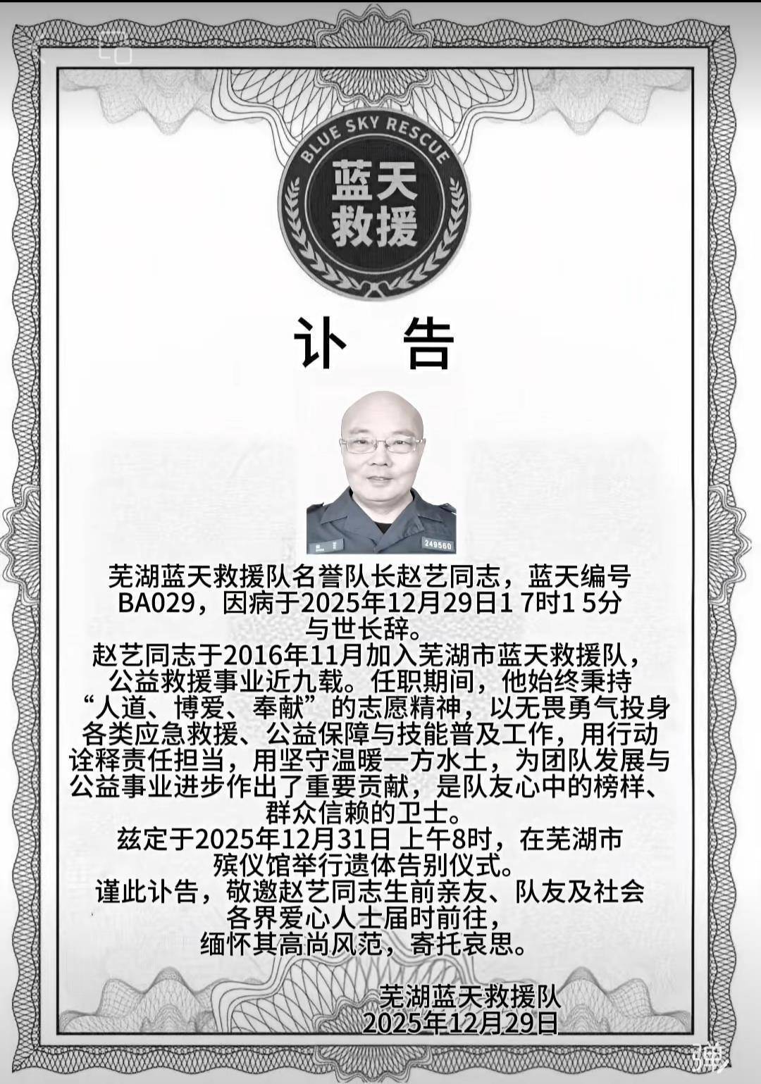 12月31日,安徽芜湖市《天天热线》节目前任主持人、芜湖市蓝天救援队名誉队长赵艺的遗体告别仪式在芜湖举行。极目新闻记者多方了解到,60岁的赵艺因病于29日去世,生前曾获安徽省劳动模范、“芜湖好人”等多项荣誉称号,当选过2008年北京奥运火炬手,其参与的公益项目帮助过数百名走失老人找到家人。